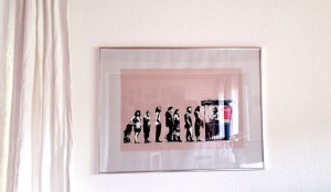 Ich bin ein Banksy Fangirl. Liebe seine Arbeiten, seine kritischen, kreativen Arbeiten und halte ihn für einen großartigen Künstler. Natürlich hängt ein Banksy in meinem Wohnzimmer